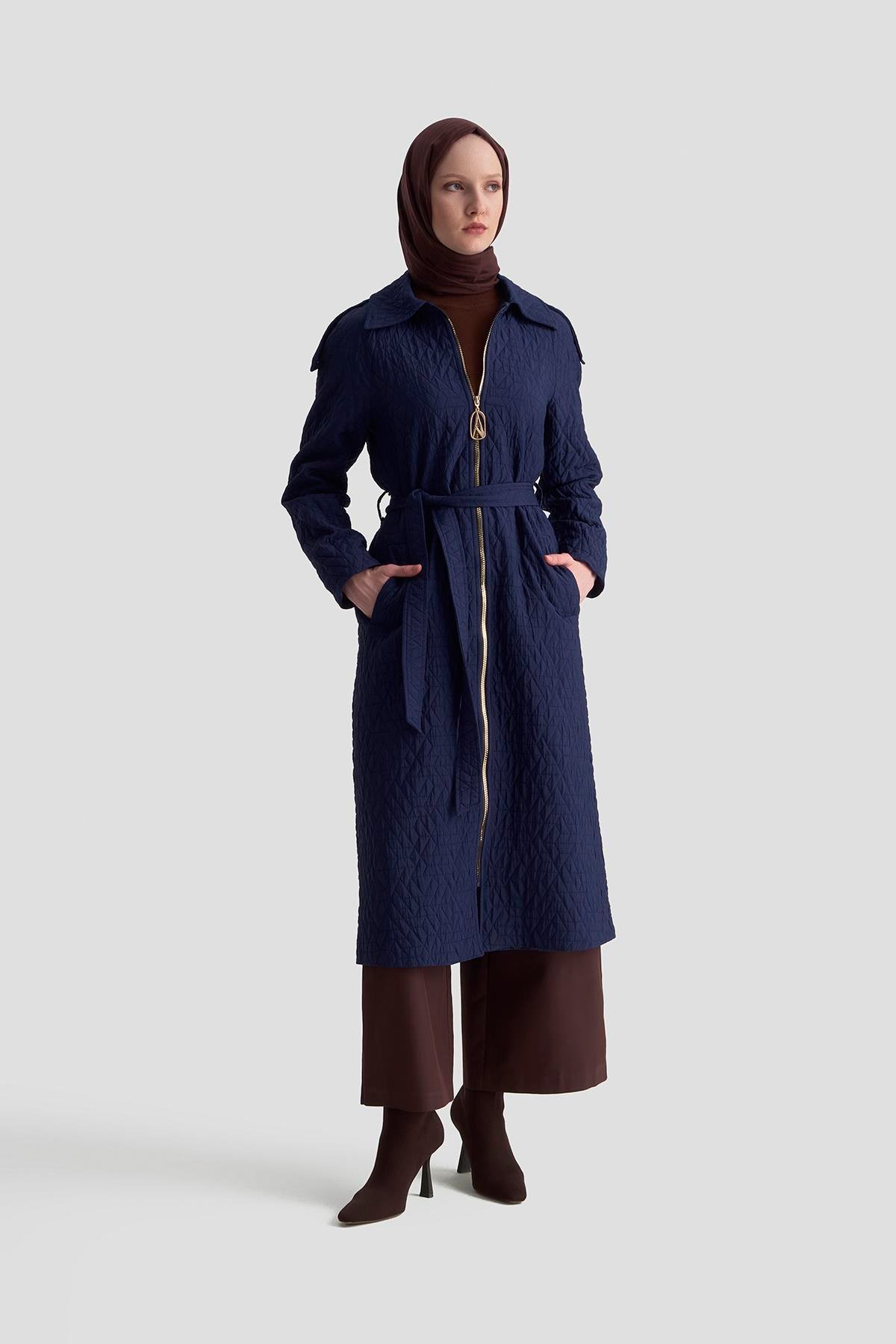 Kabartma Desenli Boydan Fermuarlı Belden Kuşaklı Kap Armine Trend 25KT717
