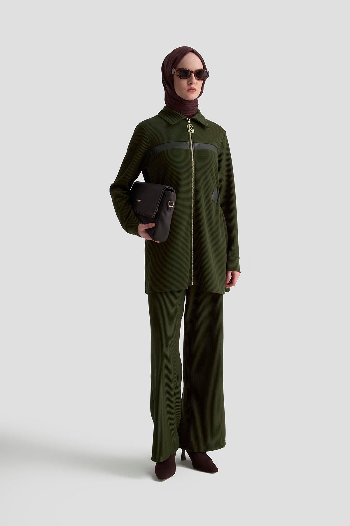 Kendinden Çizgili Pantolonlu Armine Trend Haki
