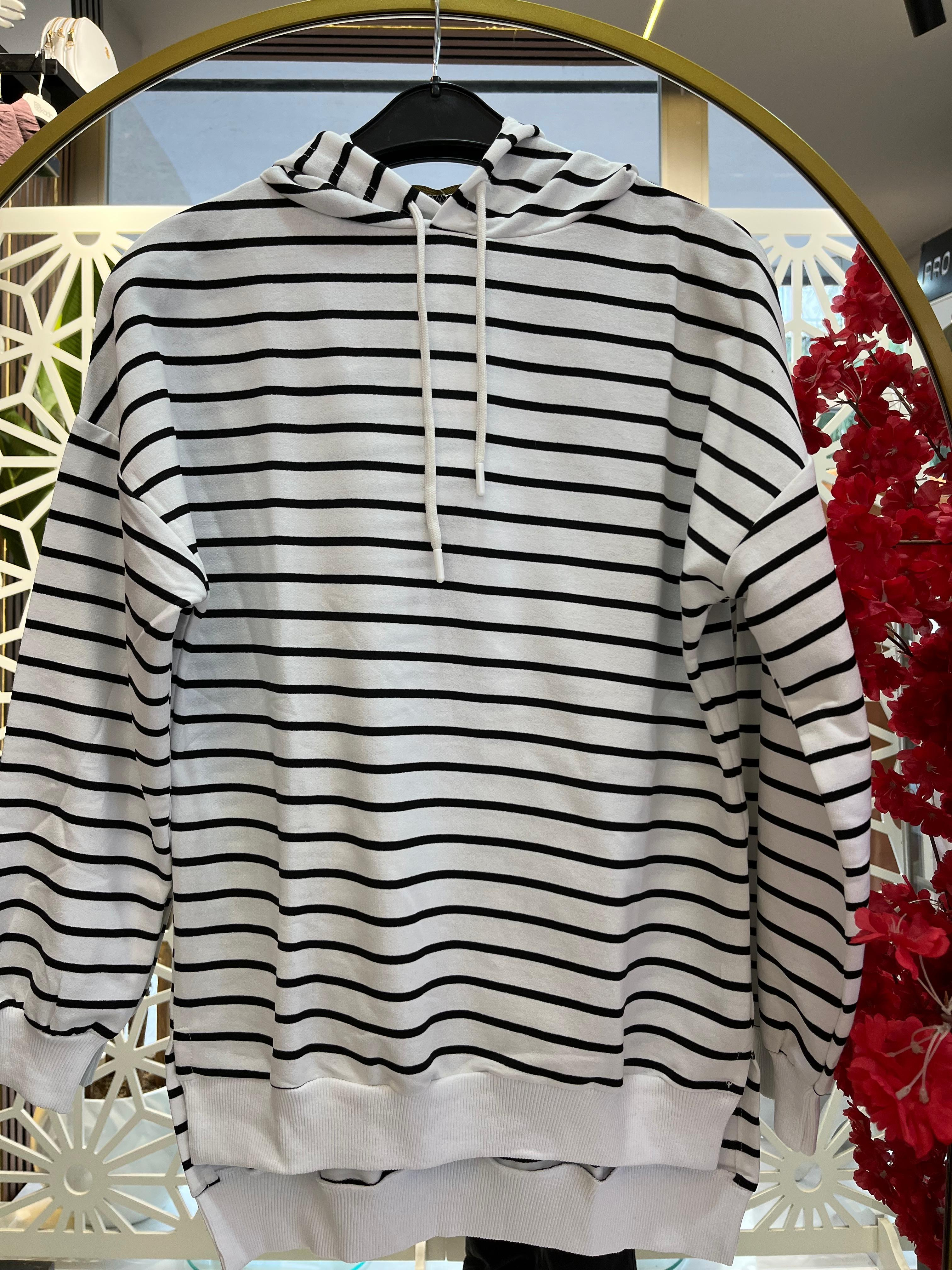 Mesica Yatay Çizgili Kapişonlu İki İplik Tunik Beyaz