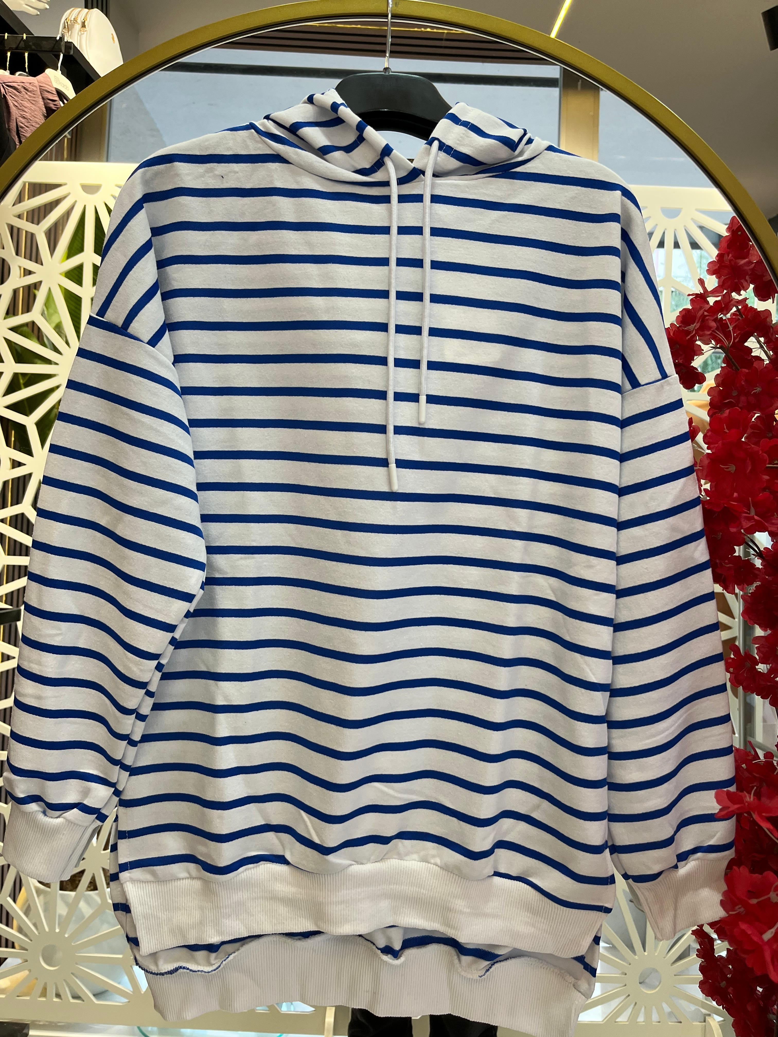 Mesica Yatay Çizgili Kapişonlu İki İplik Tunik Mavi